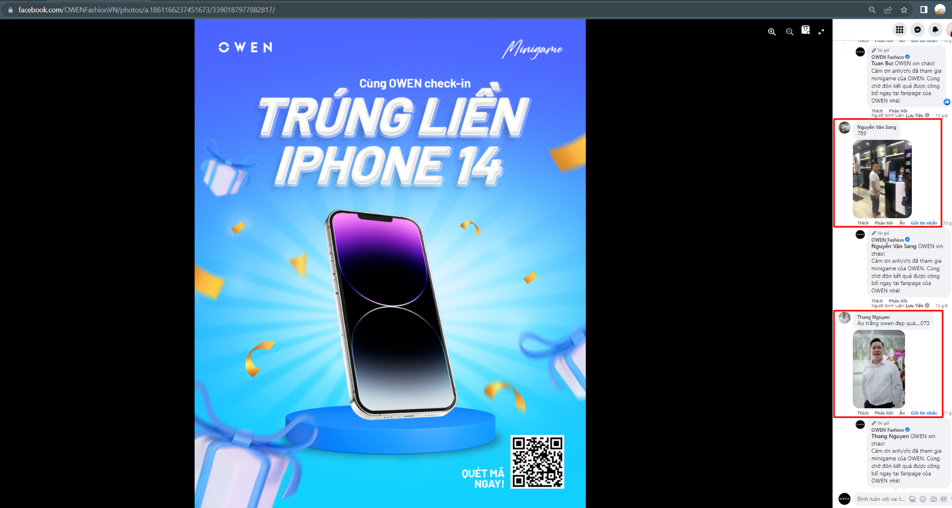 - Khách hàng comment hình ảnh vào bài Thông báo Minigame “Check in OWEN – Trúng Iphone 14” trên fanpage chính thức OWEN Fashion (tích xanh), kèm theo 01 con số may mắn (từ 000 đến 999).